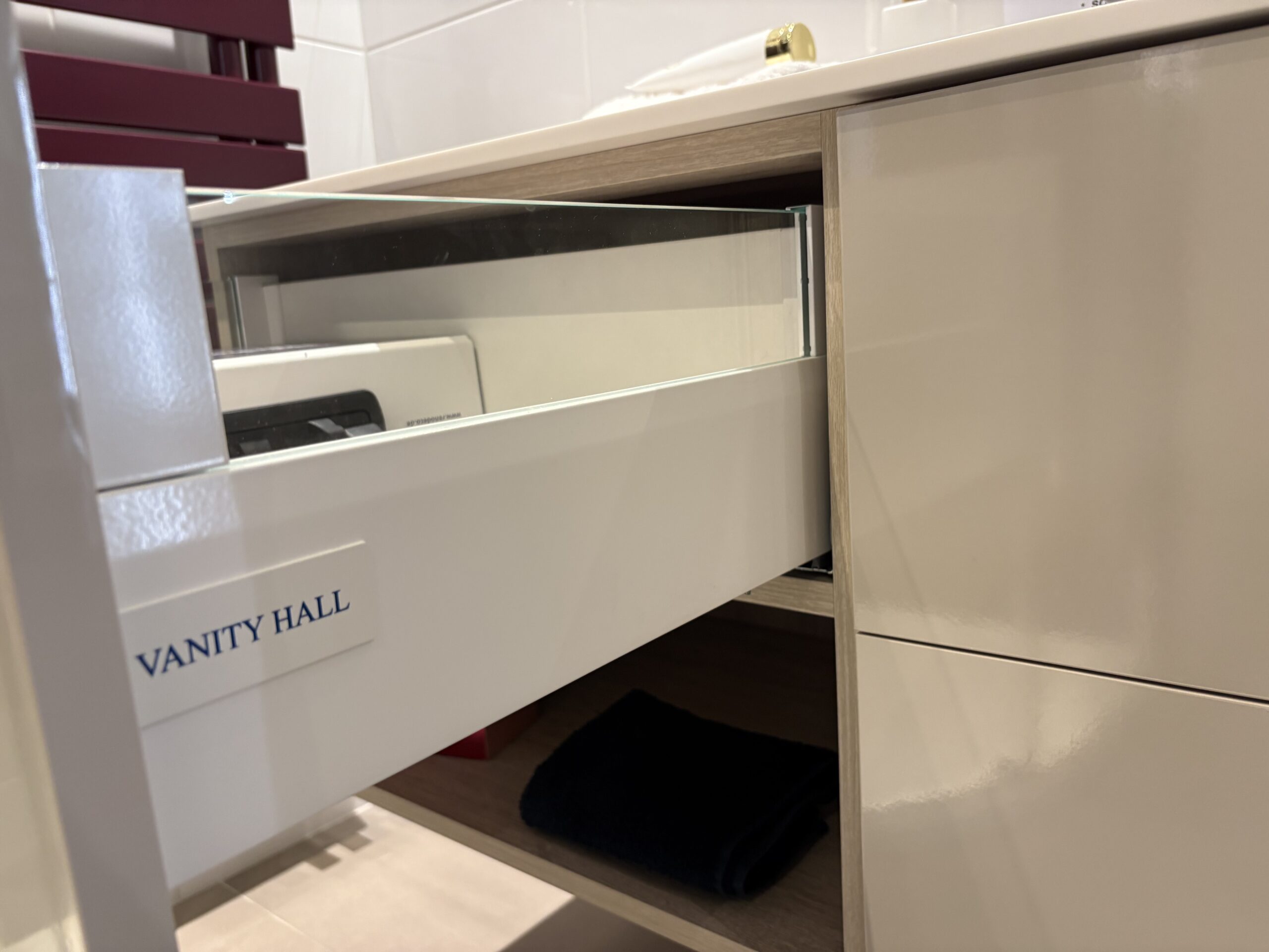 Vanity Hall VH2 Wall Mounted Push to Open Double Drawer Basin Unit c/w 12mm Corian Sparkling White Worksurface – Cashmere Gloss Door Fronts / Oregan Carcase