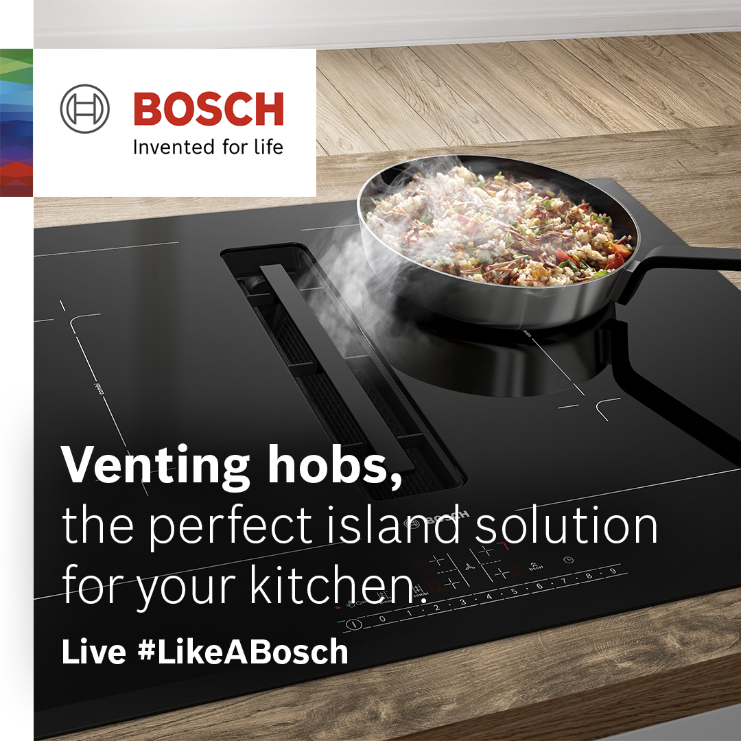 Bosch continuously develops technology to support cooking, with the perfect two in one solution the induction hobs from Bosch utilise a ventilation function that pulls steam and vapours directly from pots and pans, reducing the amount of grease and odour particles across the room which directly impacts your health.